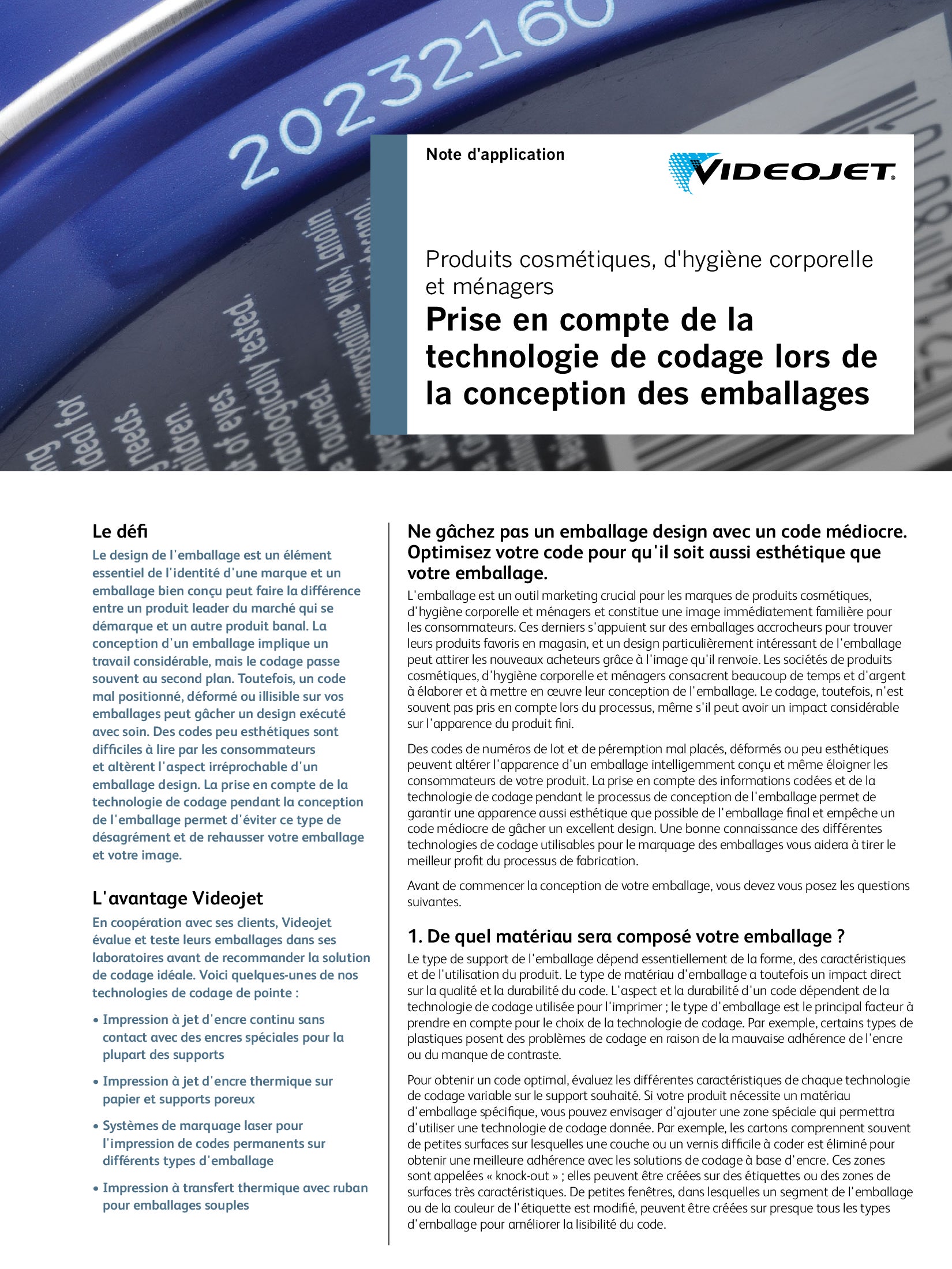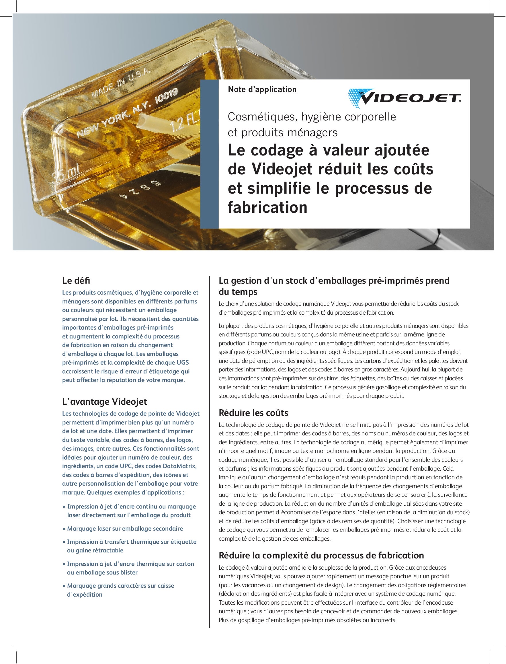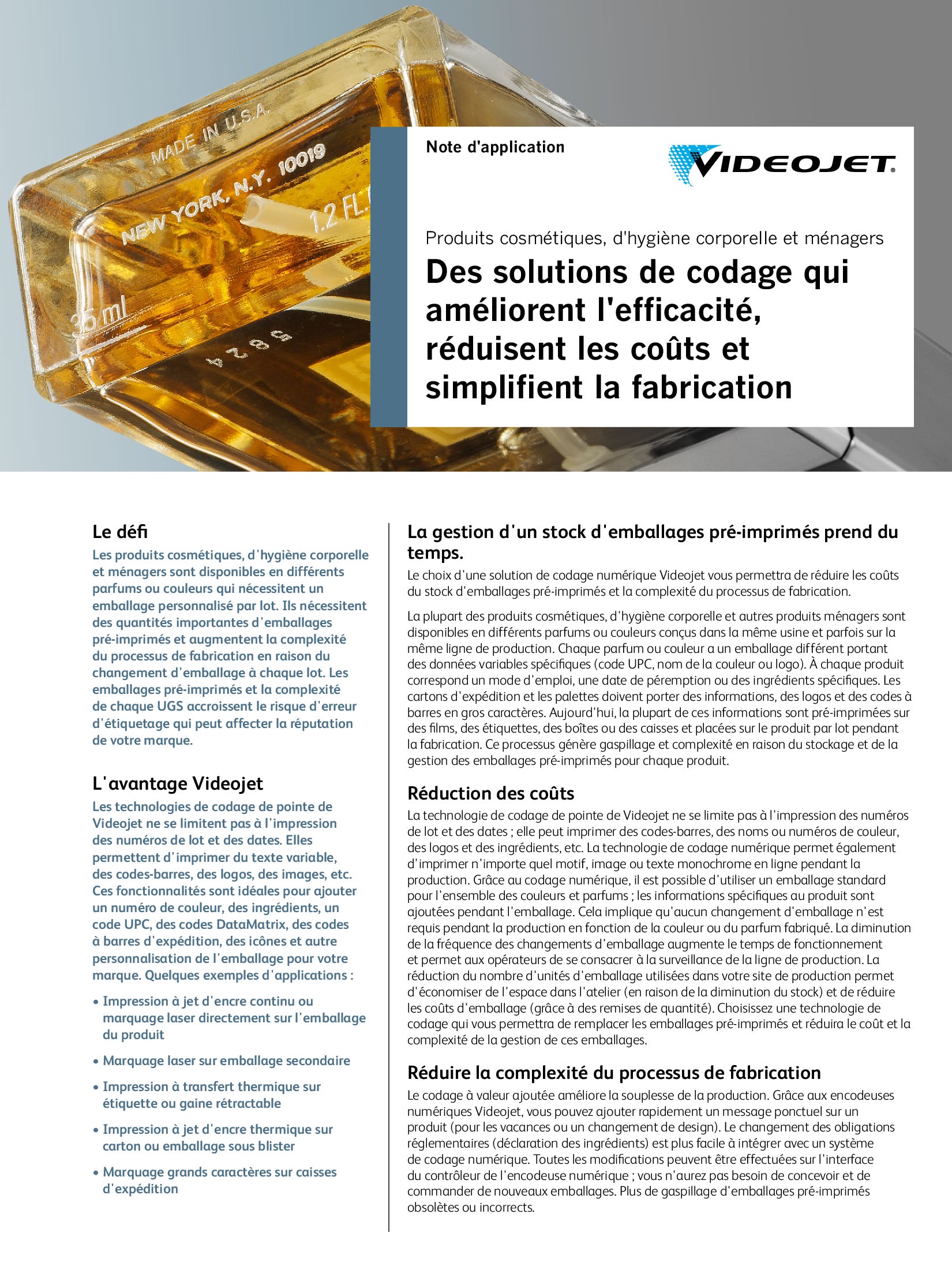 Videojet dispose des solutions de codage et marquage de vos produits cosmétique pour vous aider à imprimer à chaque fois le code idéal sur chaque produit, tout en offrant la flexibilité et le rendement dont vous avez besoin.