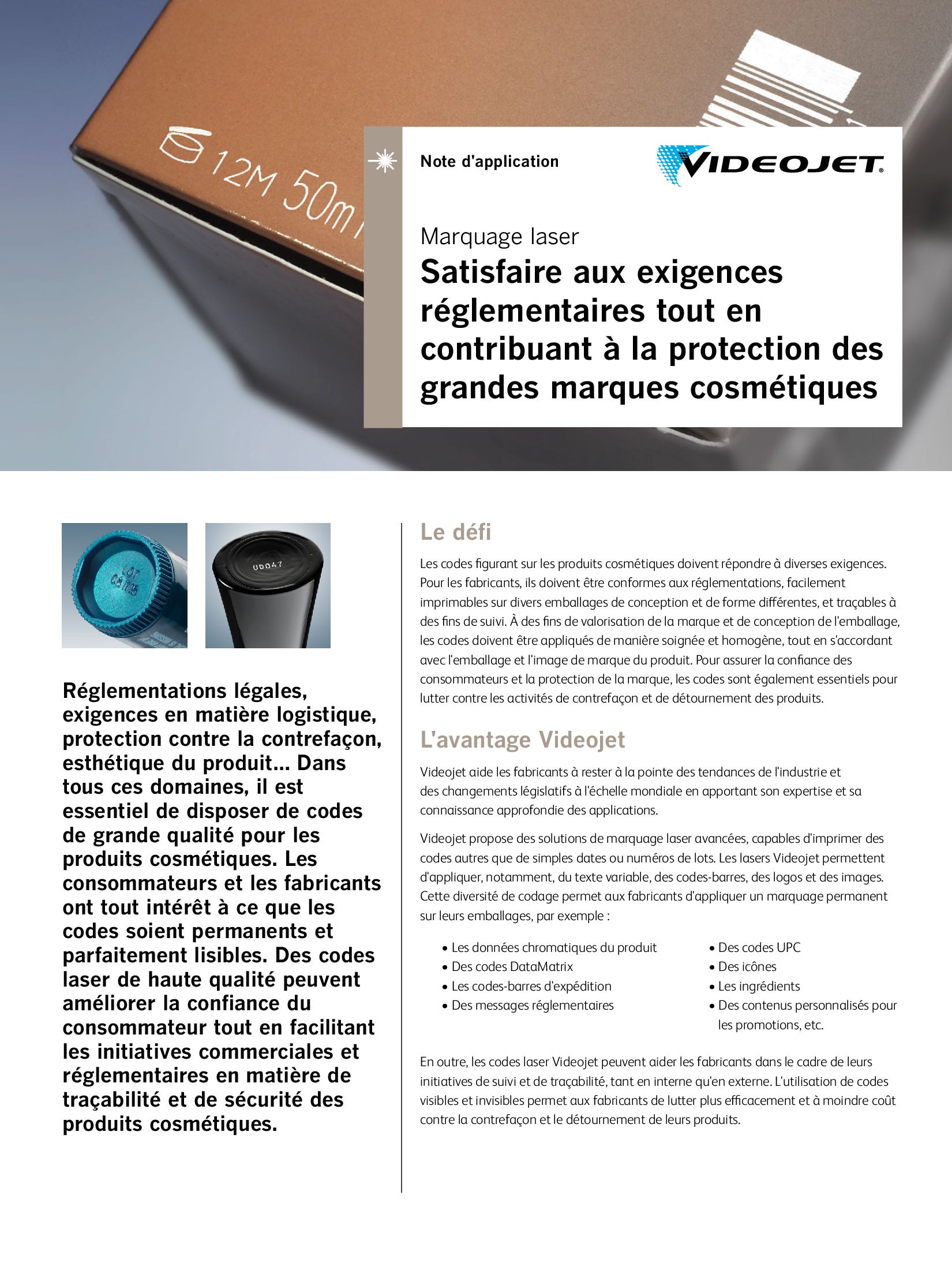Les solutions Videojet vous permettent de : Marquer au jet d’encre vos codes et dates limite d’utilisations, de graver au laser ces codes et d’étiqueter vos carton d’emballage pour un suivis de la traçabilité de vos produit cosméiques.