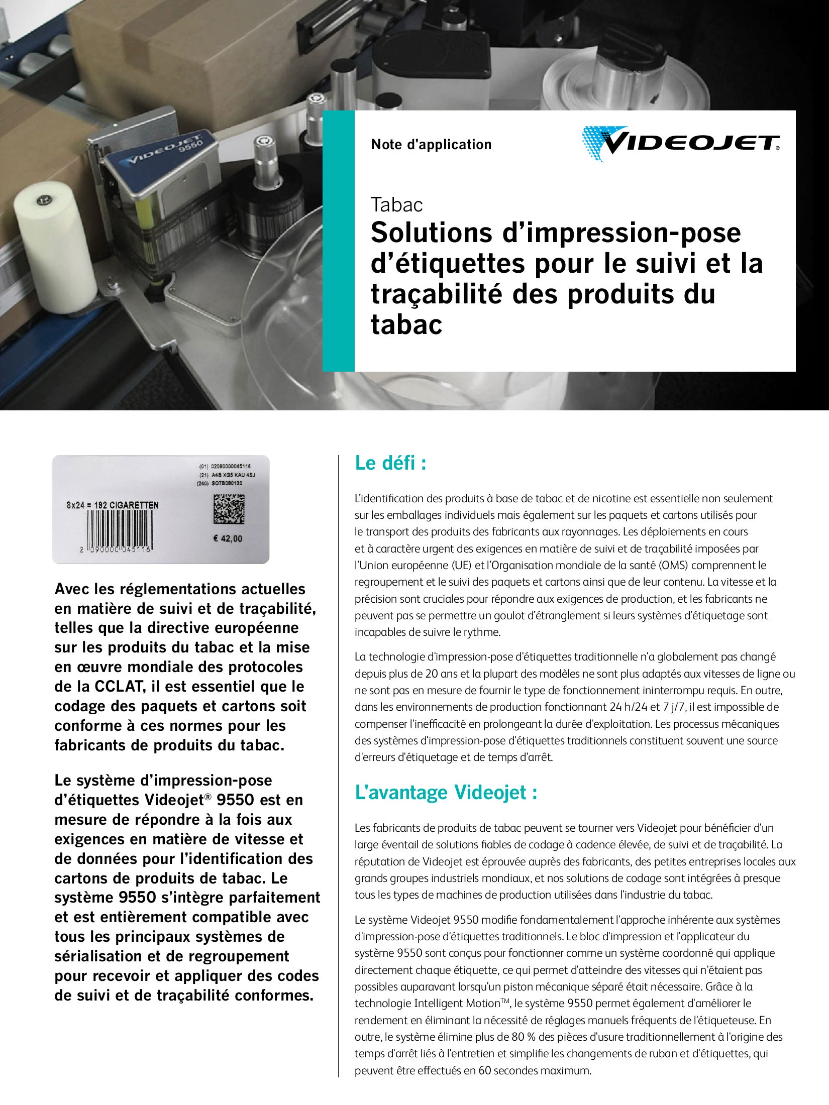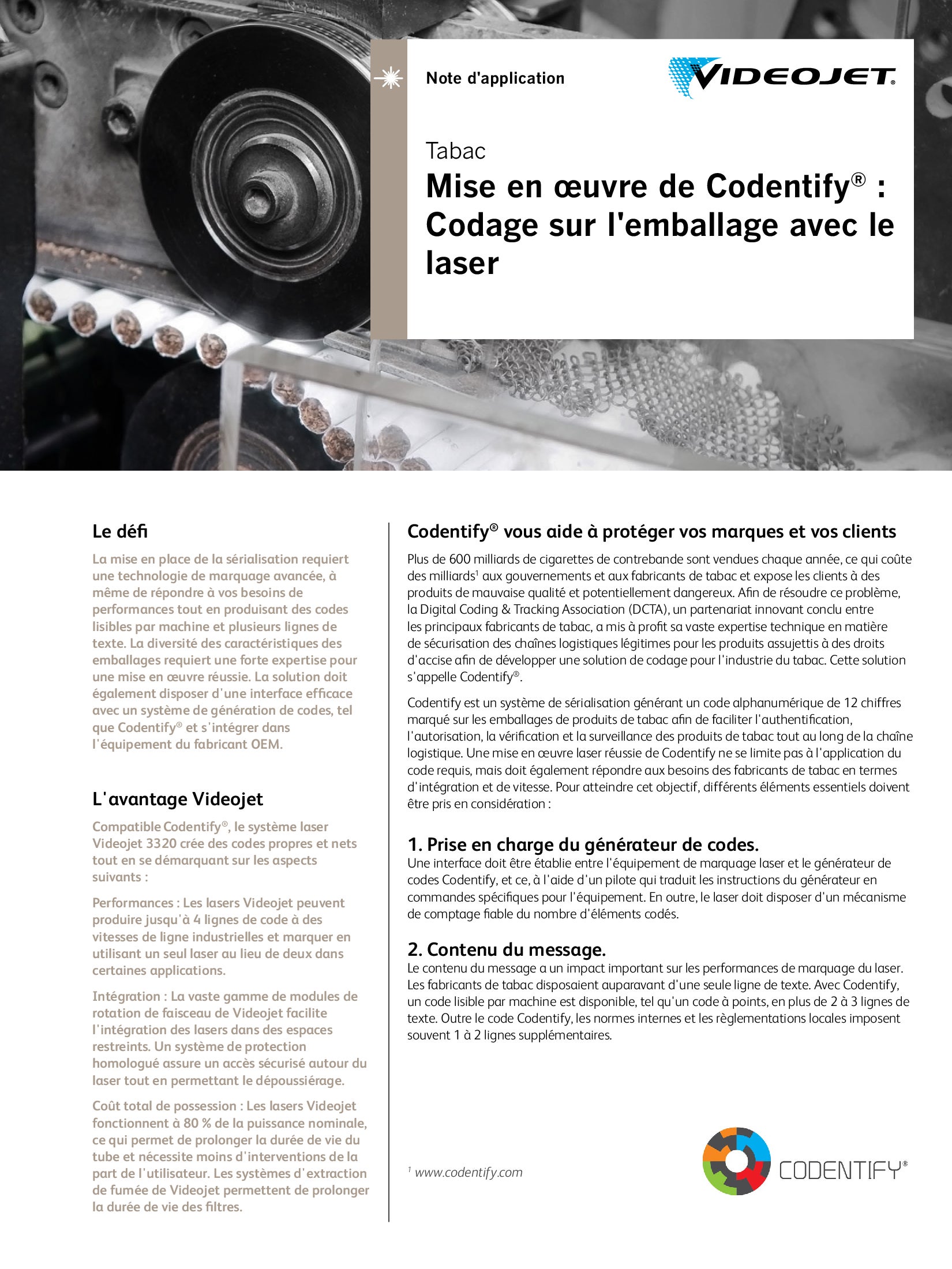 Les applications d’emballage de tabac figurent parmi les environnements de codage les plus contraignants ; notamment en raison des poussières et d’un fonctionnement à des cadences extrêmes. En outre, la propreté y est essentielle pour assurer la qualité et l’homogénéité des produits finis.