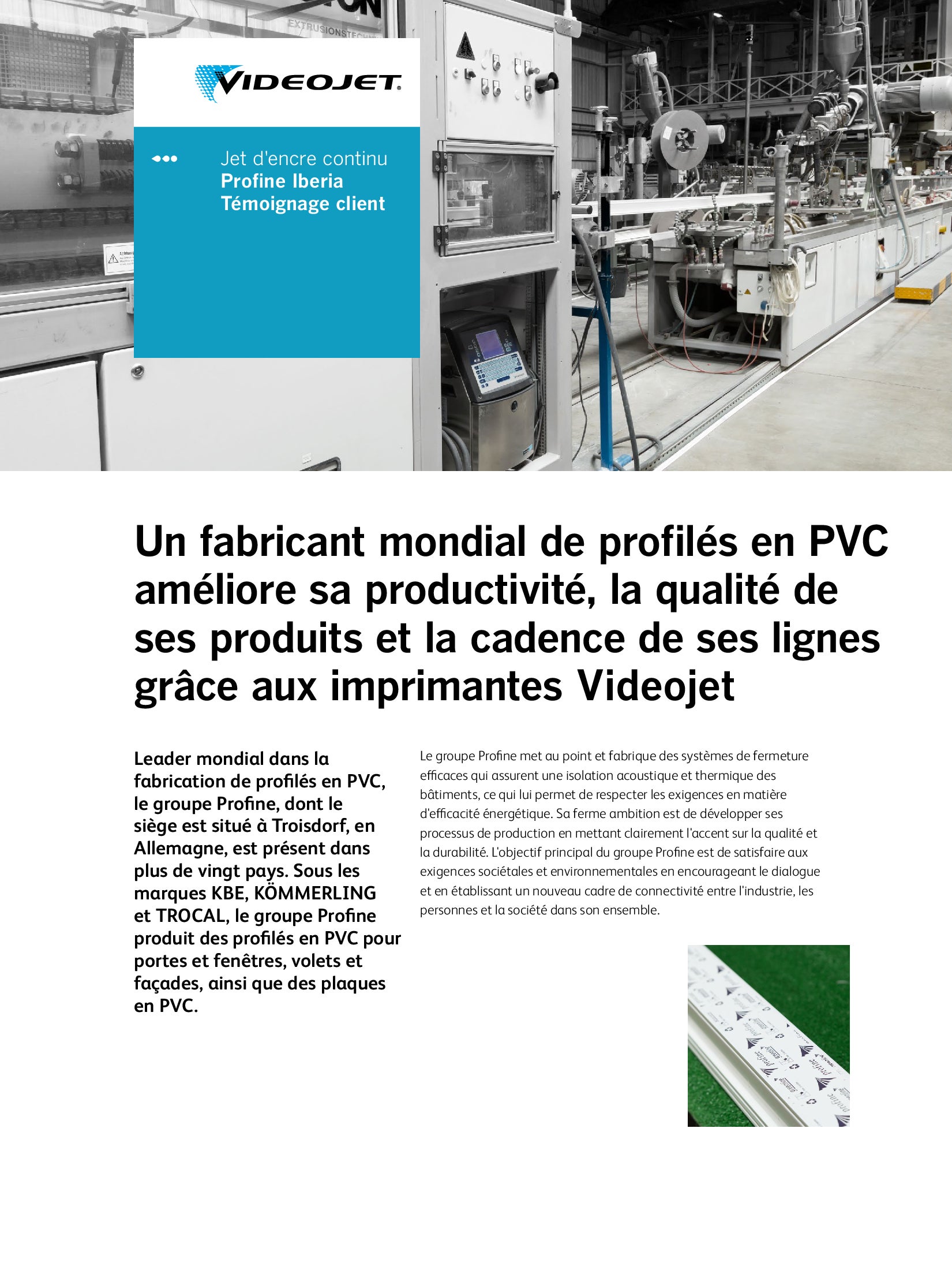 - Extrusion rigide : sur cette application, le marquage doit être placé après les opérations de formage et de refroidissement. Les imprimantes Videojet peuvent être placées n’importent où sur votre ligne de production grâce à leur forme compacte.