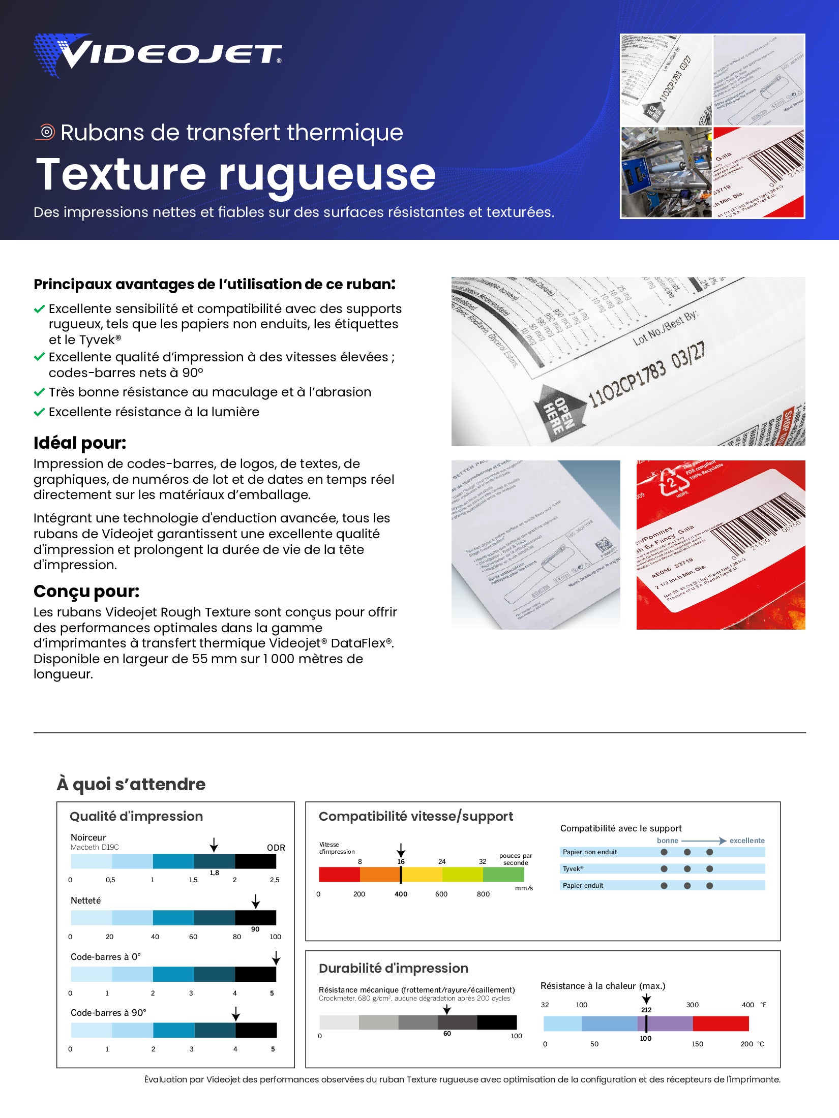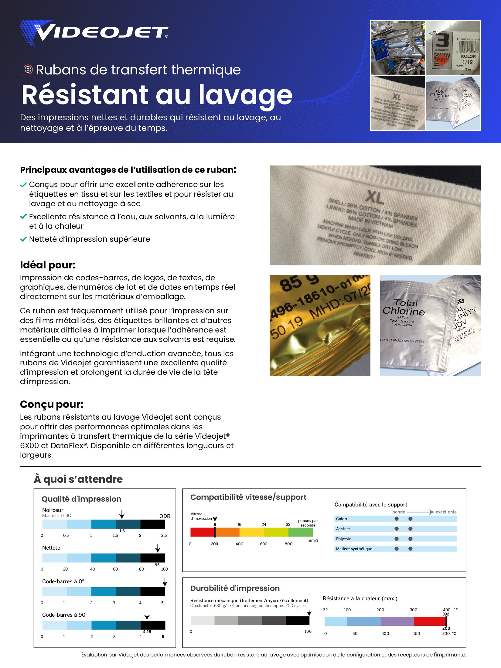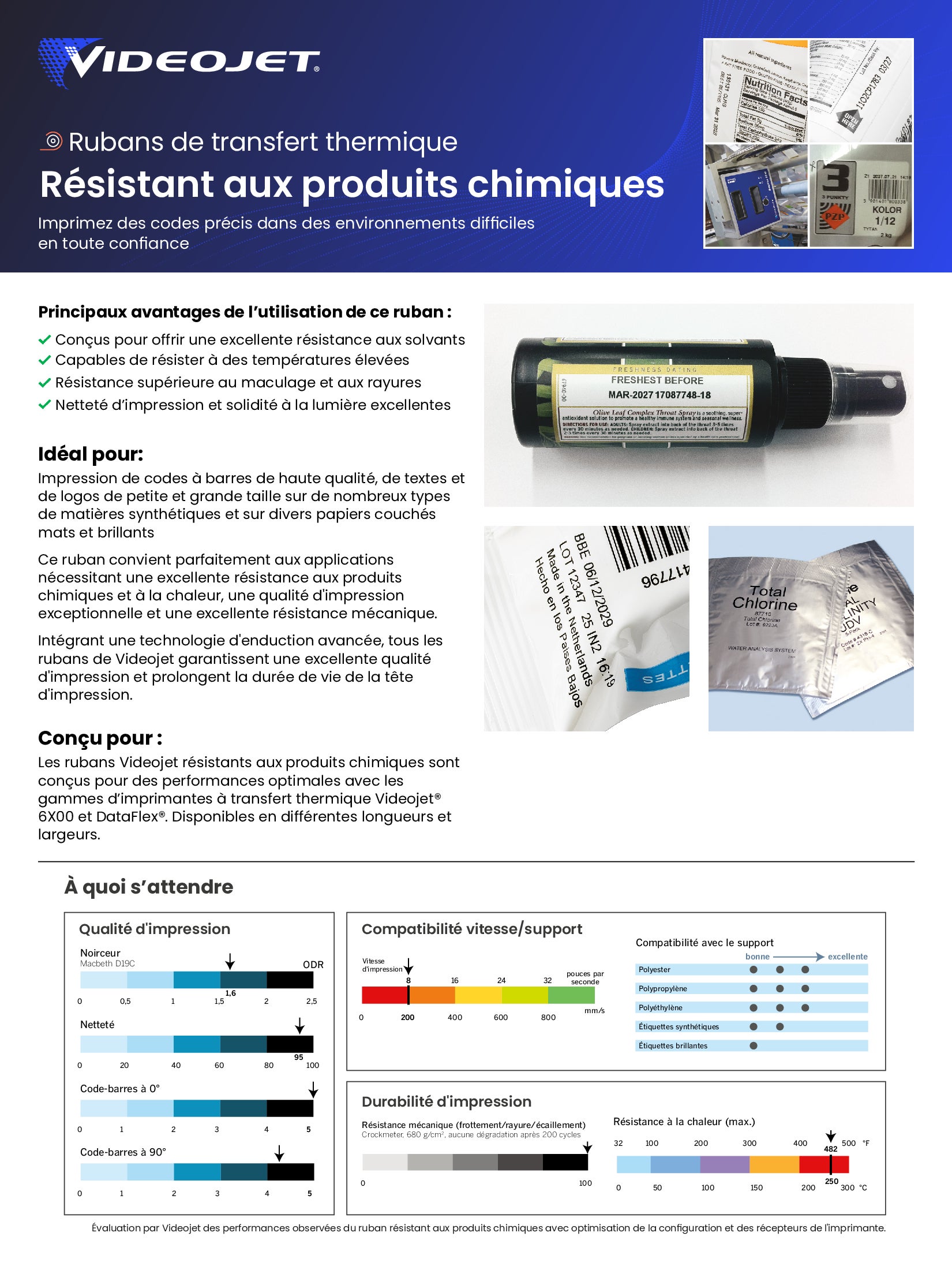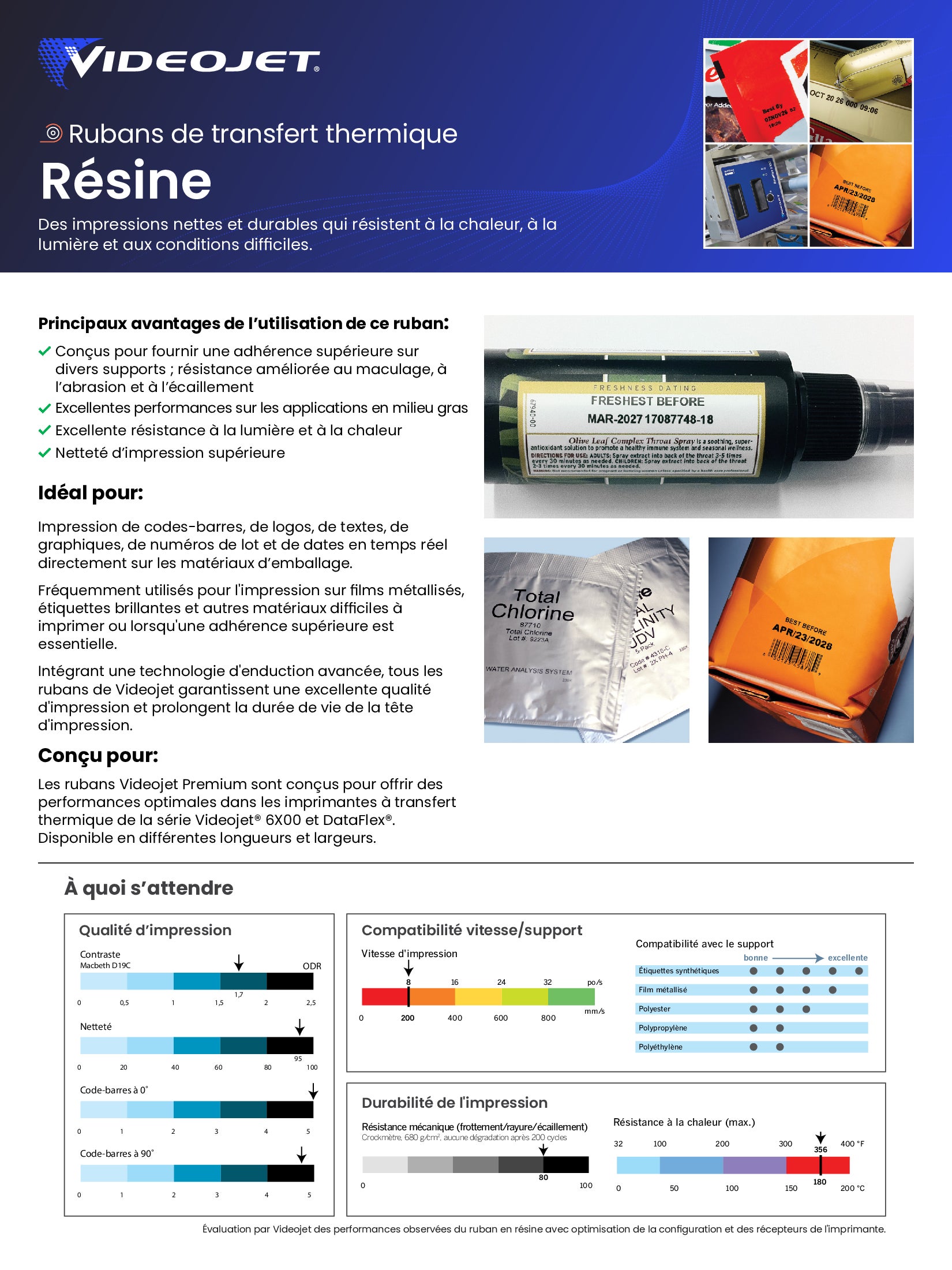 Tous les rubans de transfert thermique ne se ressemblent pas. Le choix du ruban est important car il a une incidence sur la durée de vie de la tête d’impression à transfert thermique, la qualité du code et, in fine, la disponibilité de la ligne d’emballage. Tous les rubans Videojet bénéficient d’une technologie d’enduction avancée, à savoir un revêtement à base de silicone non abrasif qui :