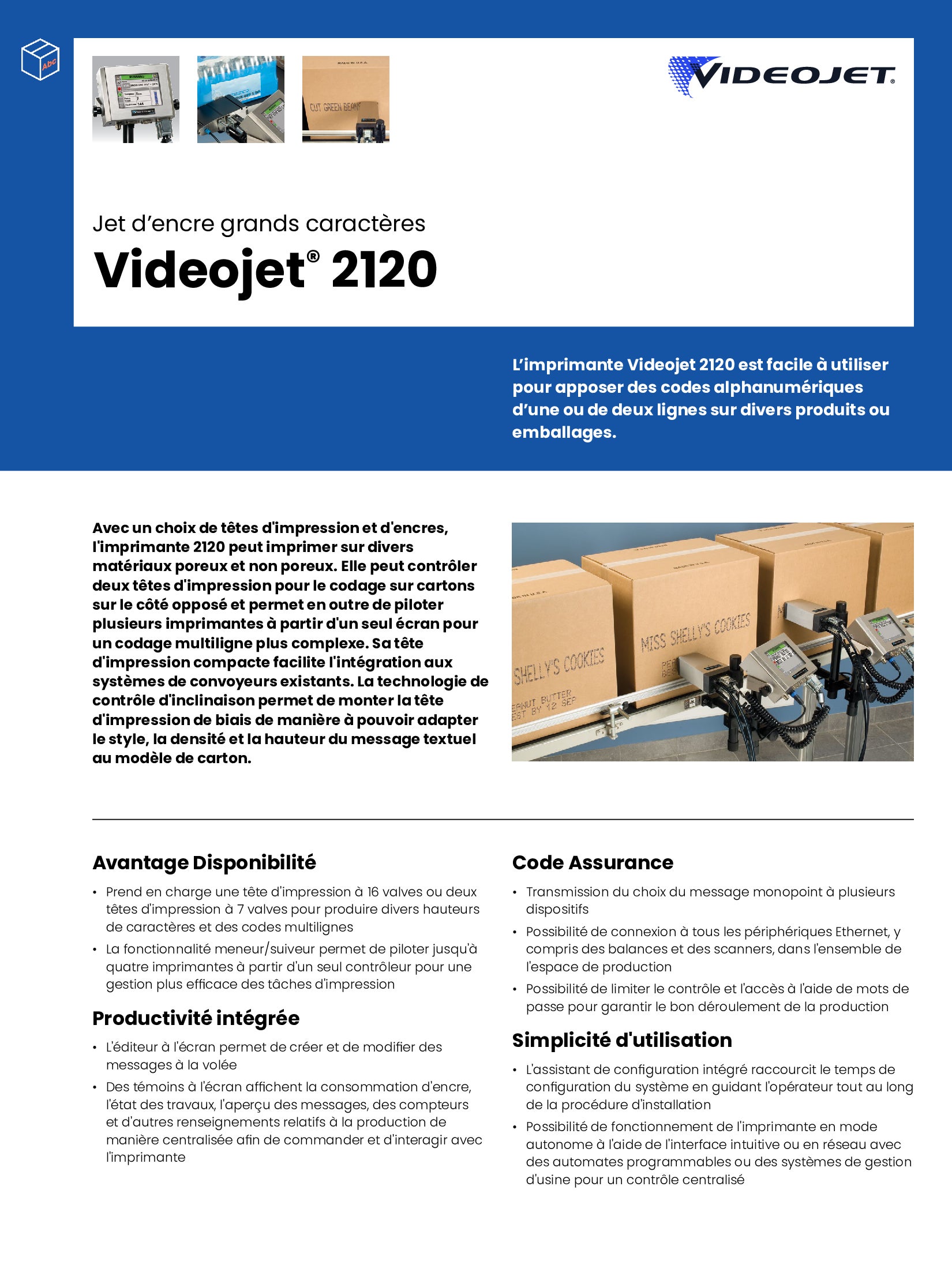 L’imprimante grands caractères Videojet 2120 est facile à utiliser pour apposer des codes alphanumériques d’une ou de deux lignes sur divers produits ou emballages. Un choix de têtes d’impression et d’encres lui permet d’imprimer sur divers matériaux poreux et non poreux. L’imprimante carton Videojet 2120 peut contrôler deux têtes d’impression pour le codage carton sur le côté opposé et permet en outre de commander plusieurs imprimantes à partir d’un seul écran pour un codage carton multiligne plus complexe.